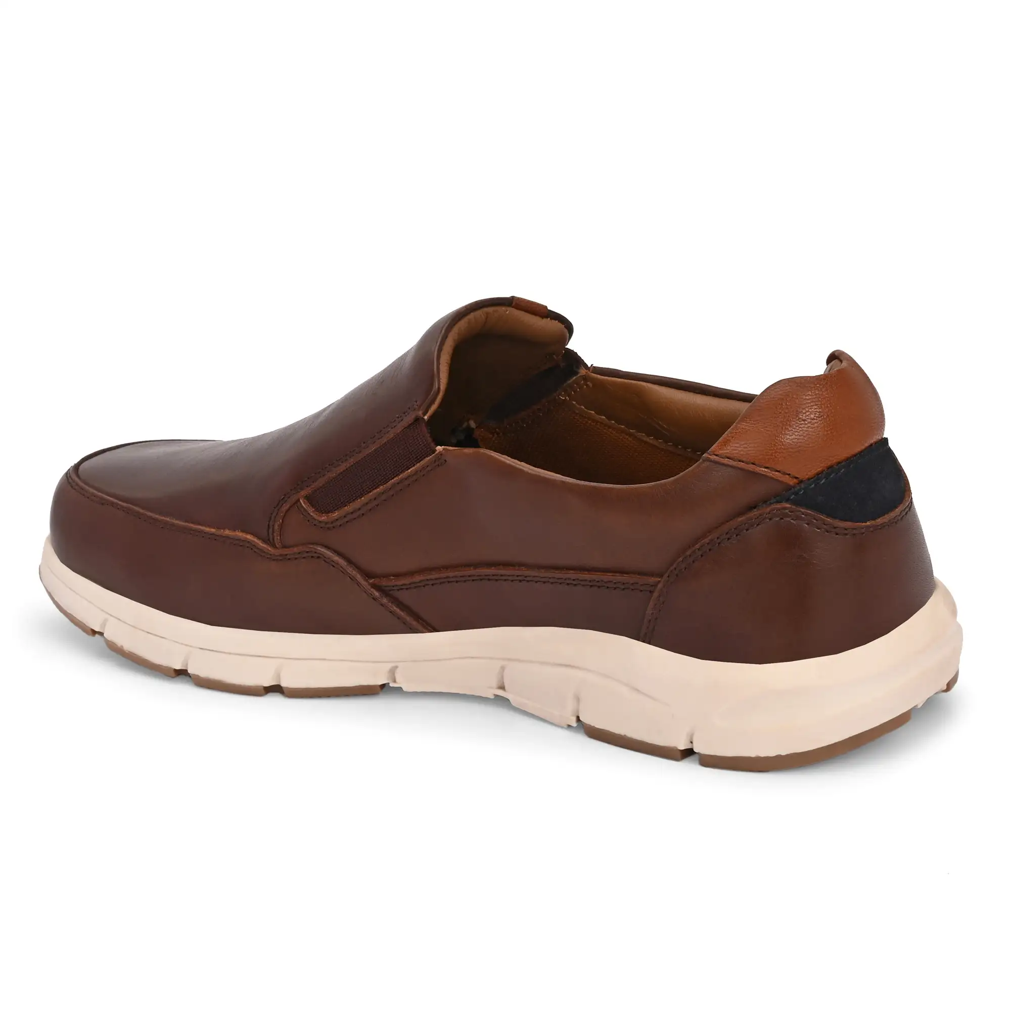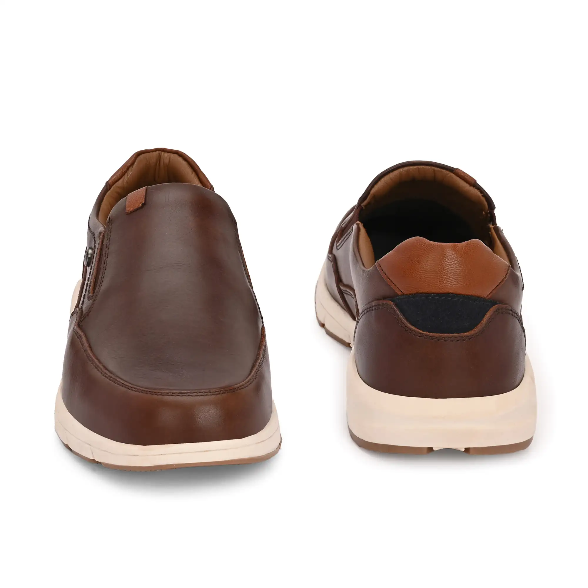Designed for all-day comfort with a rich, classic appeal, this slip-on shoe is crafted from oil pull-up leather, known for its deep colour tones and smooth, premium finish that develops character with wear. The leather naturally ages beautifully, giving each pair a distinctive look over time. Built for extended daily use, the shoe features a double-colour TPR outsole that provides excellent grip, flexibility, and shock absorption while remaining lightweight and durable. With a clean silhouette and elastic side panels for easy entry, this style offers a perfect balance of comfort, durability, and everyday sophistication.