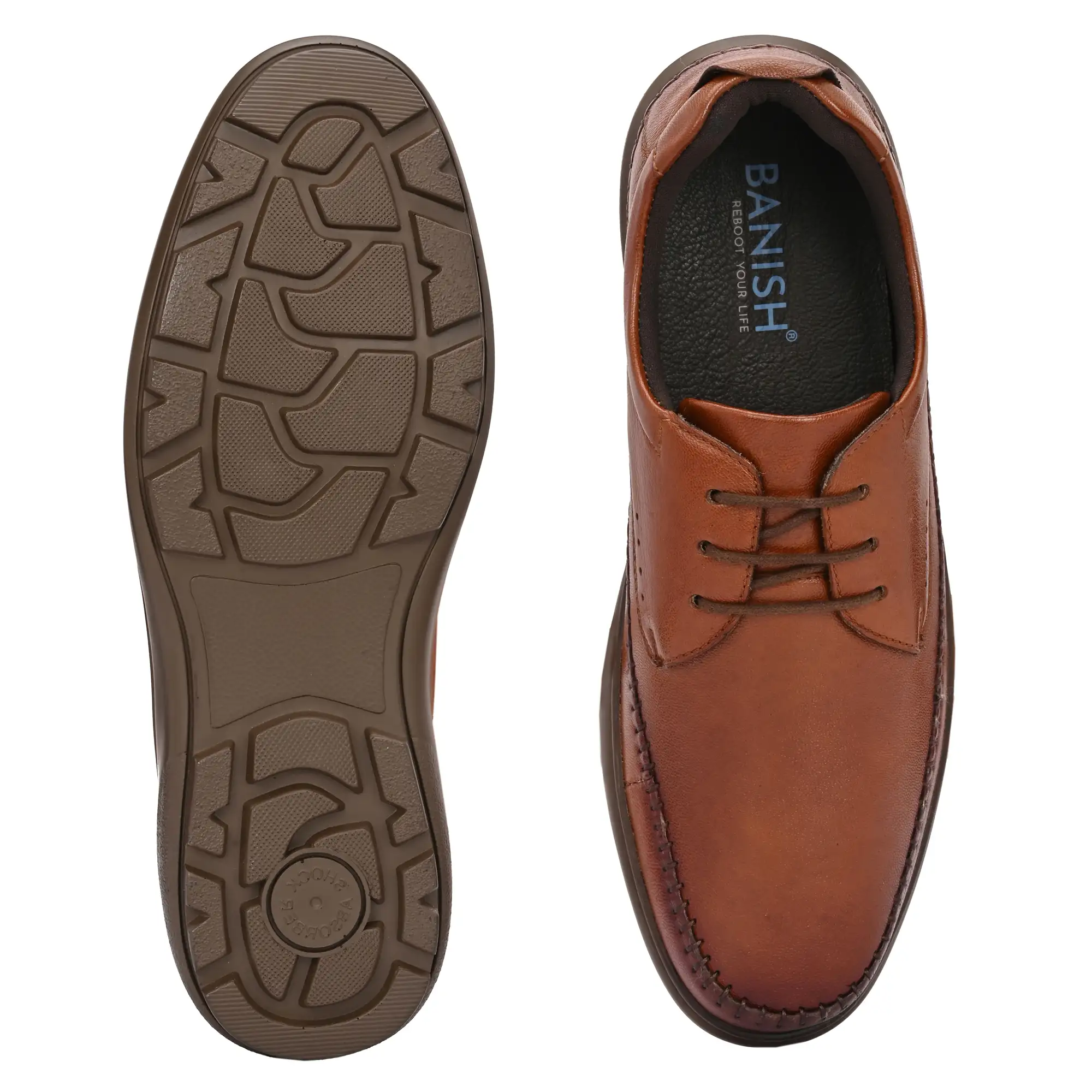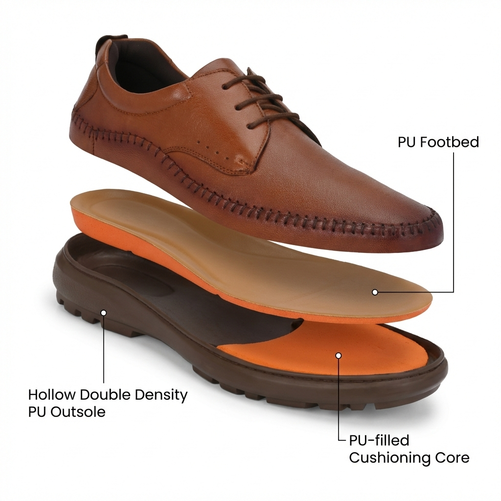 Designed for those who prefer a secure fit without compromising on comfort, AirCush Lace-Up delivers advanced cushioning with a refined, everyday look. Built with AirCush double density PU technology, the outsole is hollowed and filled with PU padding to absorb impact and reduce pressure on the feet. An added PU footbed enhances softness and support, creating a dual-layer cushioning system ideal for long hours of wear. The lace-up design provides better fit control and stability, making this style perfect for office wear, daily use, and extended walking comfort.