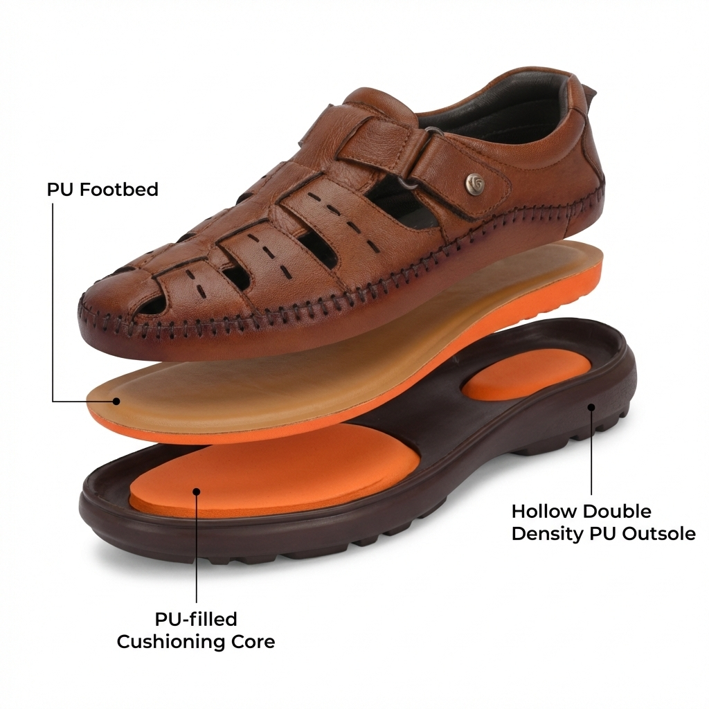 Built for superior everyday comfort with added breathability, the AirCush Sandal is designed using advanced AirCush double density PU technology to deliver a soft, cushioned walking experience. The outsole is hollowed and filled with PU padding to absorb shock and reduce pressure on the feet, while an additional PU footbed enhances underfoot comfort. The breathable sandal-style upper allows better airflow, making it ideal for long hours of wear, especially in warmer conditions. Combining comfort, durability, and ease of wear, the AirCush Sandal is perfect for daily use, travel, and extended walking.