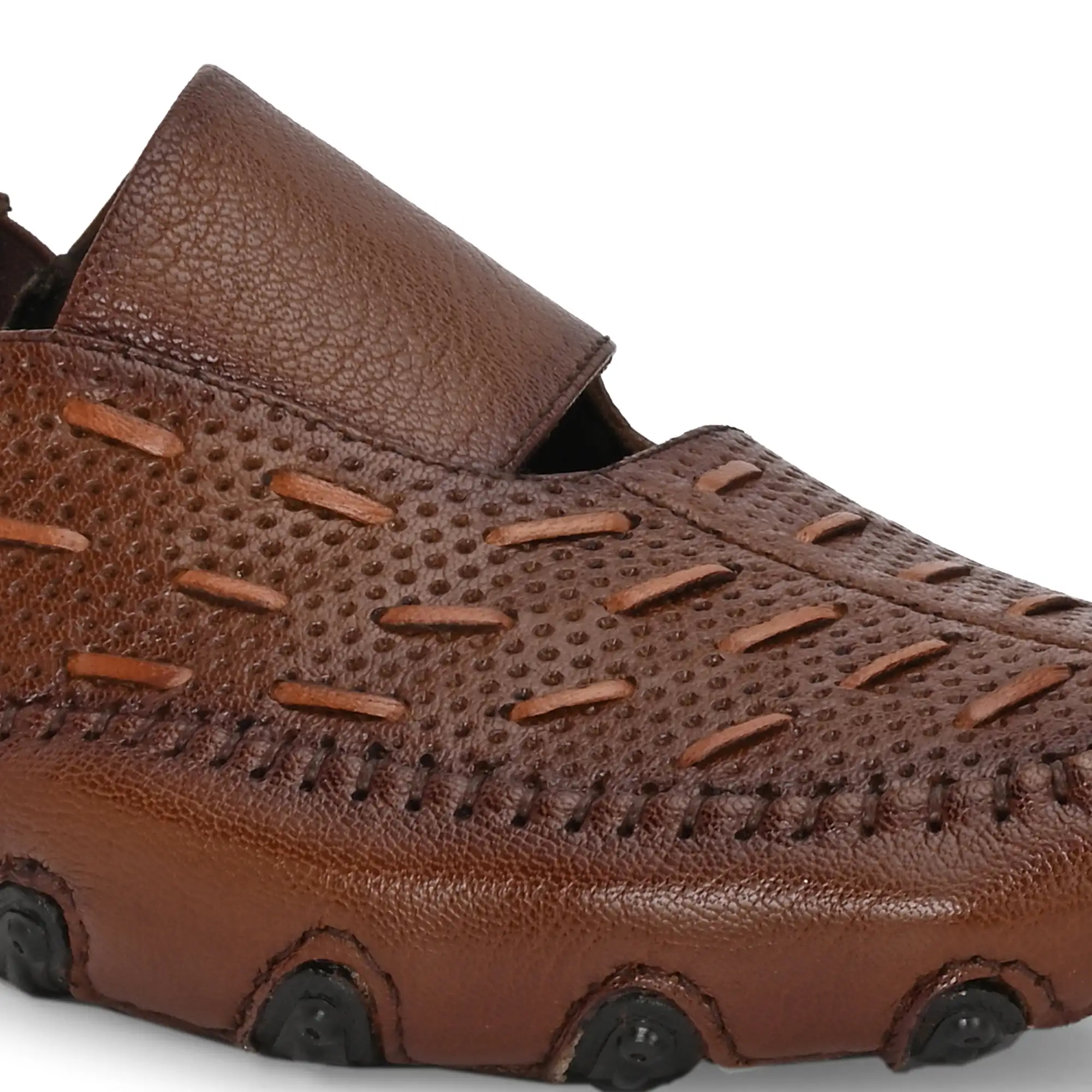 Hand-stitched leather loafer sandal crafted from premium tumbled leather. Designed for all-day comfort with breathable perforations, a cushioned PU footbed, and a durable stitched sole—perfect for smart casual and everyday wear.